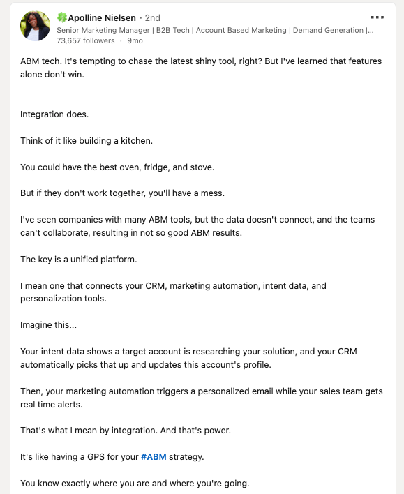 Bottom line: ABM isn’t just about targeting accounts; it’s about integrating content strategy with the tech stack. Ownership of both the content and the tools that deliver it ensures engagement, measurable results, and a connected, outcome-driven account journey.